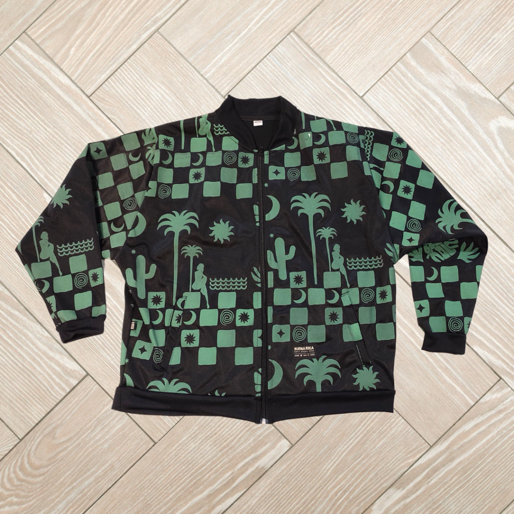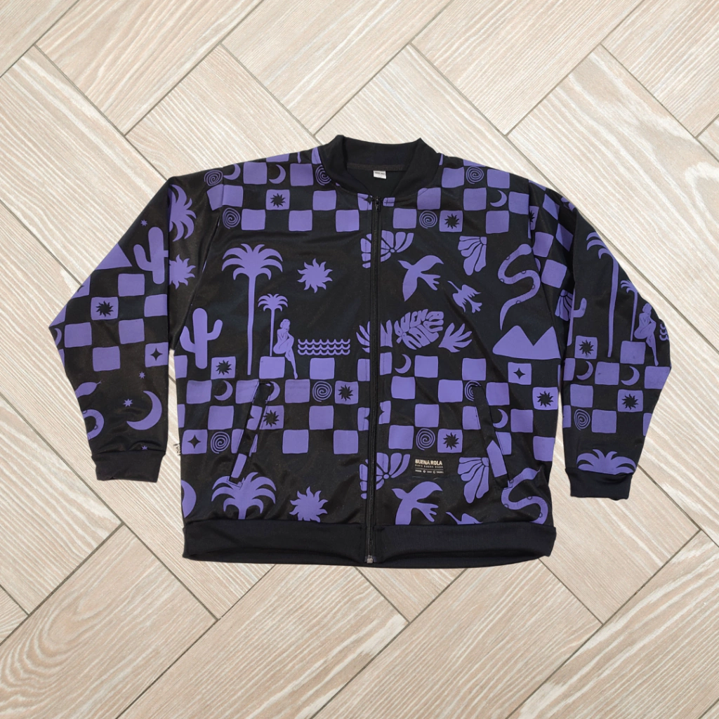 Campera de acetato frizado fino con estampa full en serigrafia al agua.